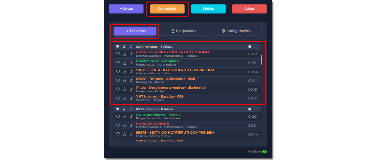 No menu "Comerciais", na aba "Próximos", você terá a oportunidade de visualizar com considerável antecedência o conteúdo de cada bloco comercial programado para a grade do dia. Isso proporciona uma visão detalhada e prévia das próximas inserções comerciais em sua programação, permitindo uma melhor gestão e planejamento de sua estratégia de marketing. Essa funcionalidade oferece maior controle sobre os comerciais que serão veiculados, permitindo ajustes e análises prévias para garantir uma sequência comercial mais alinhada aos objetivos da sua rádio.