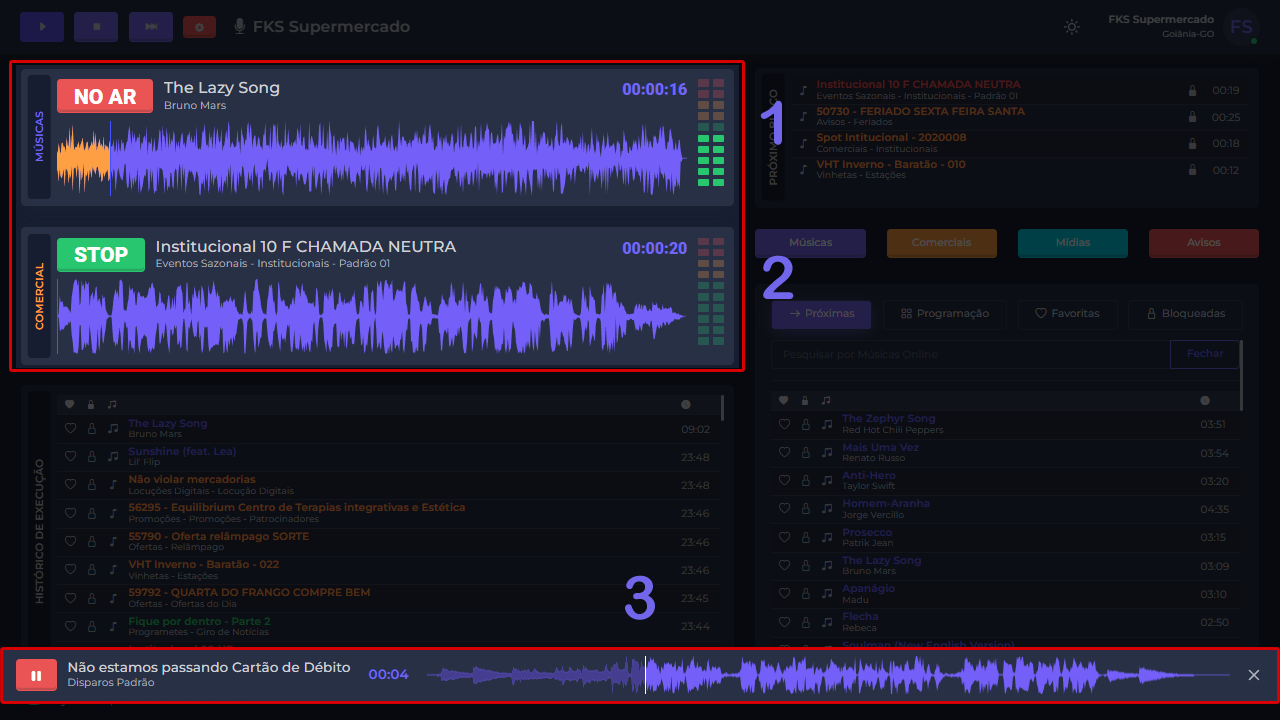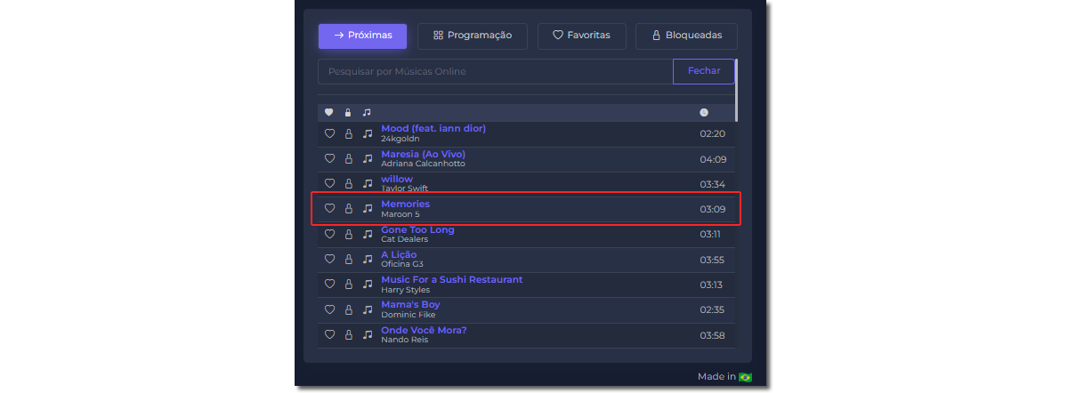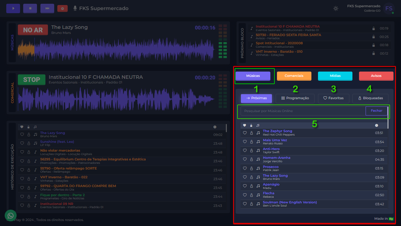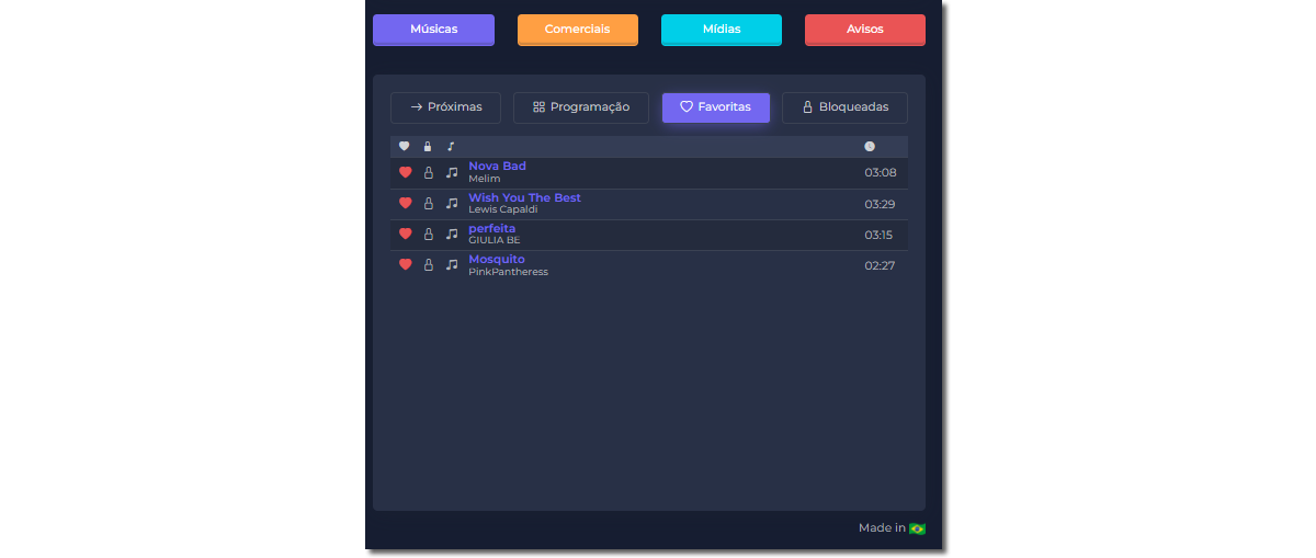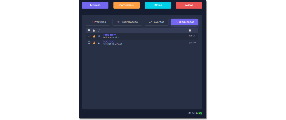 Modal de Música (Número 10): - Este é o modal que é aberto quando você clica em VER MÚSICA. Nesta lista, você poderá ouvir, favoritar, bloquear, conferir o tempo da mídia e também inserir a música desejada na sequência da sua programação clicando no botão PRÓXIMA.