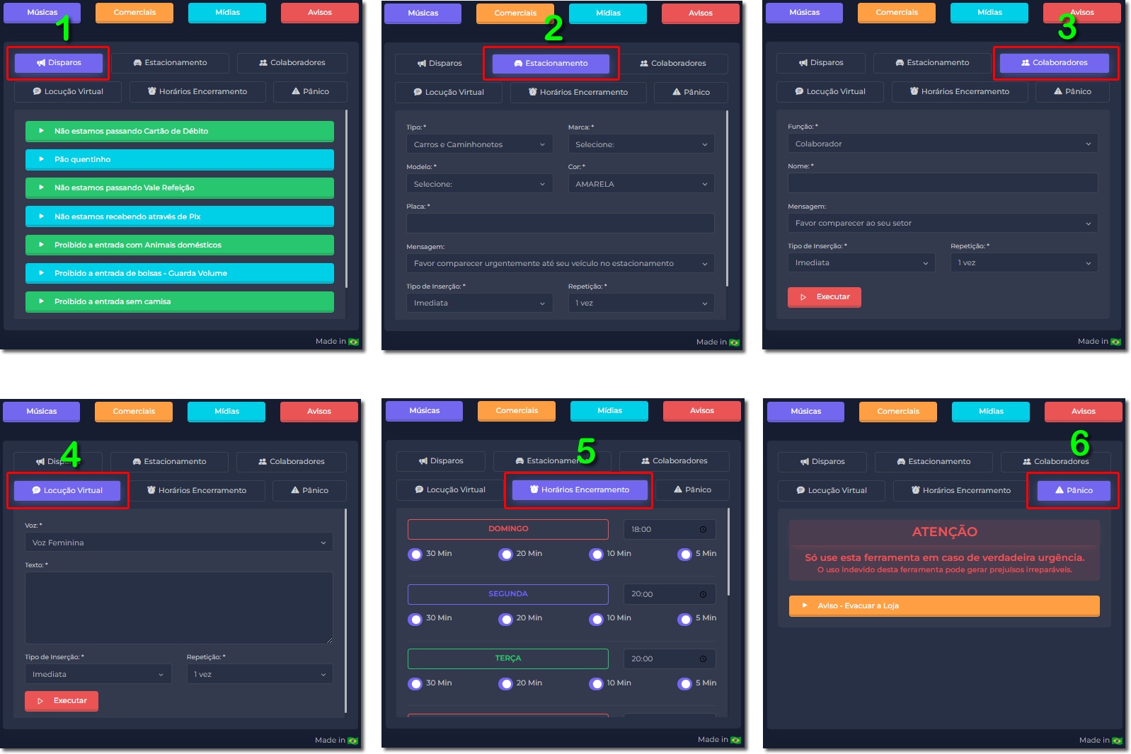 Nesta aba de avisos, você terá várias opções para executar áudios de forma automatizada, sem depender de solicitação de áudio do estúdio.