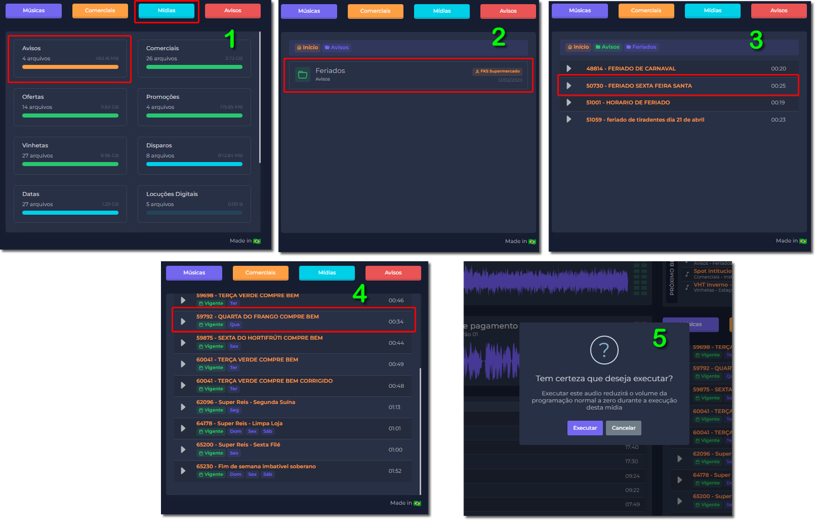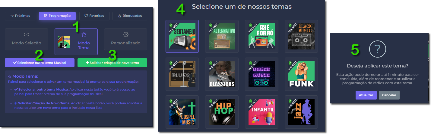 Confirmação (Número 5): - Tela de confirmação para atualizar a programação musical com o novo tema escolhido.