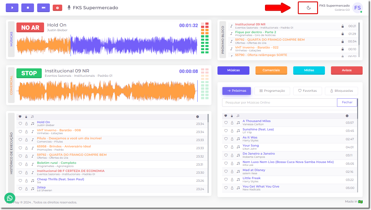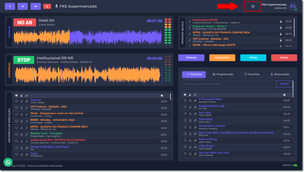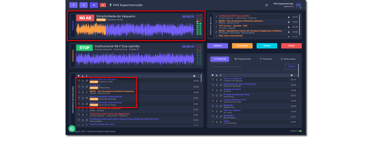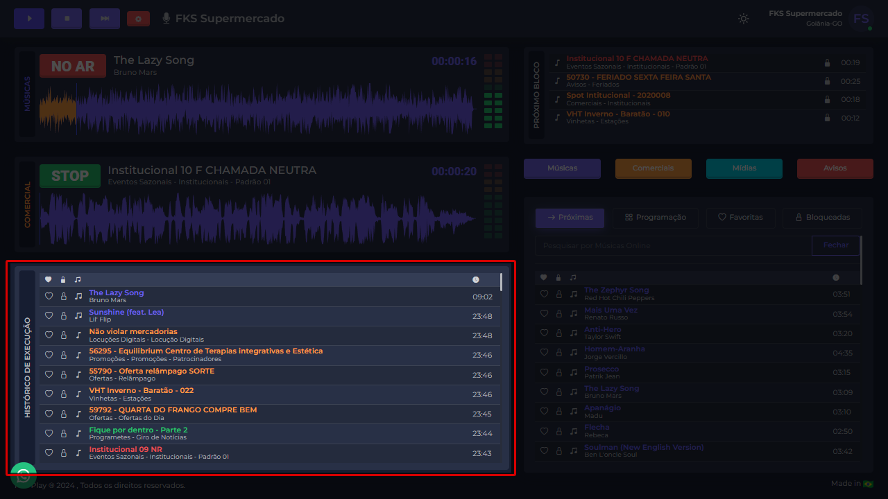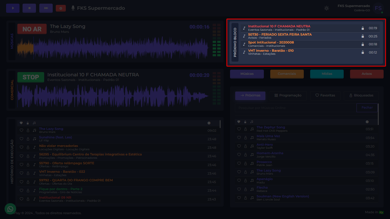 "Na plataforma FksPlay, você pode antecipadamente acompanhar a lista de todas as músicas que vão tocar na sequência da sua programação musical. Além disso, é possível efetuar bloqueios e assinalar faixas como favoritas diretamente nesta listagem. Confira todos os detalhes dessa funcionalidade."