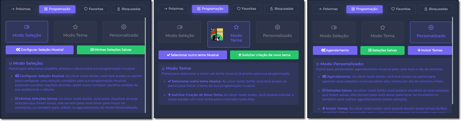 MODO PERSONALIZADO: Este é o modo mais completo, onde você poderá montar suas seleções, incluindo playlists, artistas, álbuns, músicas e temas. Pode configurar uma grade musical para cada hora de cada dia da semana, proporcionando um agendamento perfeito para quem gosta de ter algo minimamente detalhado musicalmente, do seu jeito e com seu gosto. Este modo exige um pouco mais de conhecimento e treinamento, mas conte conosco para fornecer todas as instruções necessárias para seu aprendizado.