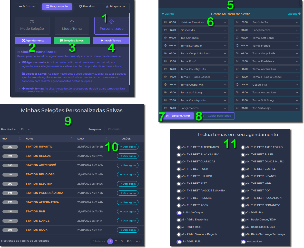 Agendar (Número 2): - Ao clicar neste botão, você terá acesso ao painel para agendar suas seleções musicais salvas e/ou temas por dia da semana e hora.