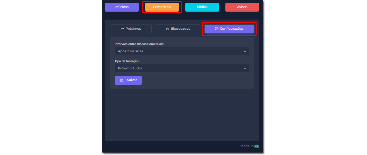 Nesta aba de configurações, você tem uma função importantíssima. Aqui, você definirá quantas músicas devem tocar no intervalo entre blocos comerciais. O melhor é que você pode alterar essa configuração a qualquer momento, proporcionando flexibilidade para ajustar a dinâmica da sua programação conforme necessário.