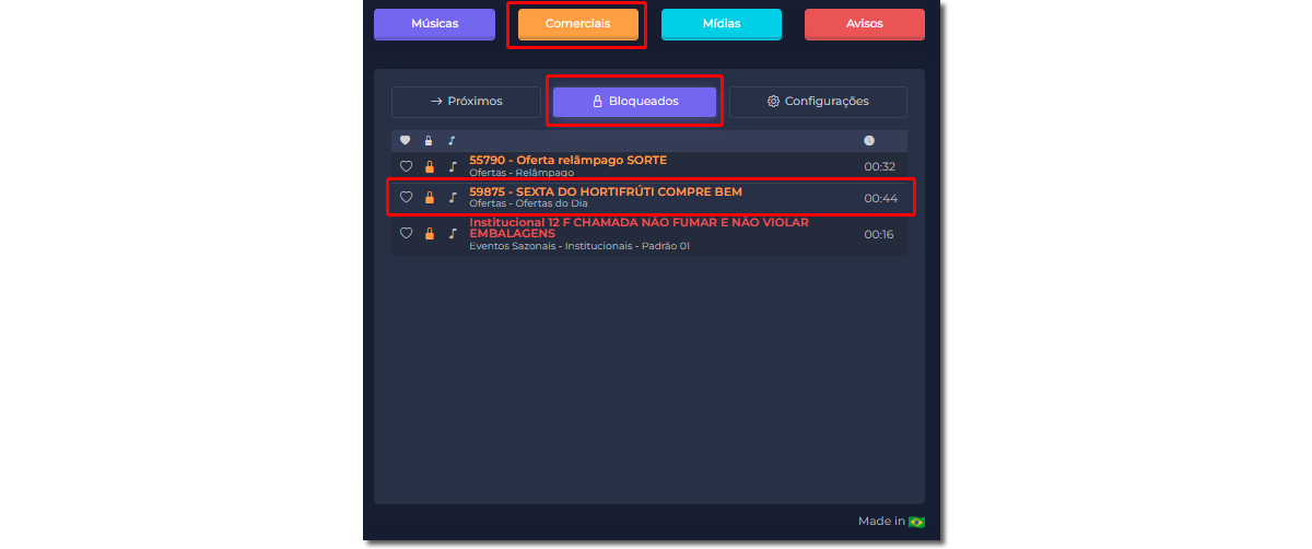 Nesta aba de bloqueados, você tem acesso à lista de todos os comerciais bloqueados para conferência. Aqui, você poderá fazer a gestão desse conteúdo de forma simples e prática, mantendo-os bloqueados ou desbloqueando conforme necessário. Essa funcionalidade proporciona controle sobre os comerciais veiculados na sua rádio, permitindo ajustes de acordo com as estratégias comerciais e preferências da audiência.
