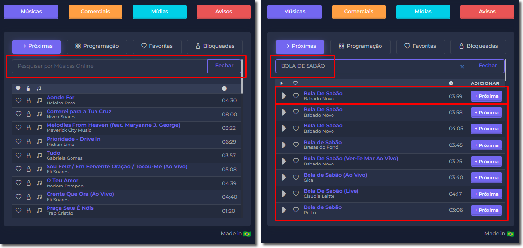 Neste campo de pesquisa, você pode digitar o nome de uma música ou o nome de um artista, e será exibida uma lista de opções para a sua escolha. No exemplo abaixo, foi feita uma pesquisa pelo nome "BOLA DE SABÃO", resultando em vários intérpretes que cantam essa música. Para selecionar, basta clicar no botão "PRÓXIMA", e a música escolhida será reproduzida imediatamente em sua programação musical. Para sair dessa tela, clique em "FECHAR".