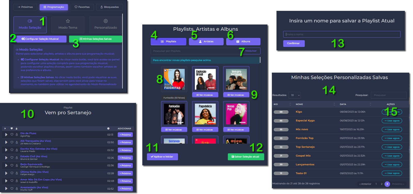 Salvar Seleção (Número 12): - Aqui você poderá salvar a seleção atual. Ou seja, esta seleção incluindo tudo que você tenha marcado entre playlists, artistas e álbuns, poderá ser salva como uma seleção e ser usada posteriormente, como listado na figura de número 14.
